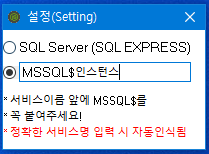 위와 같이 설정 화면이 뜬다면 두번째란을 선택하신 후 MSSQL$ 을 포함하여 인스턴스명을 뒤에 붙여주시면 됩니다.